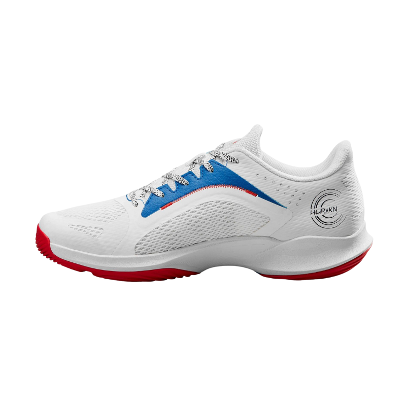 Découvrez les chaussures de padel Hurakn 2.0, une paire présentée par Wilson. De couleur blanche, elles sont rehaussées par quelques éléments rouges et bleus.
